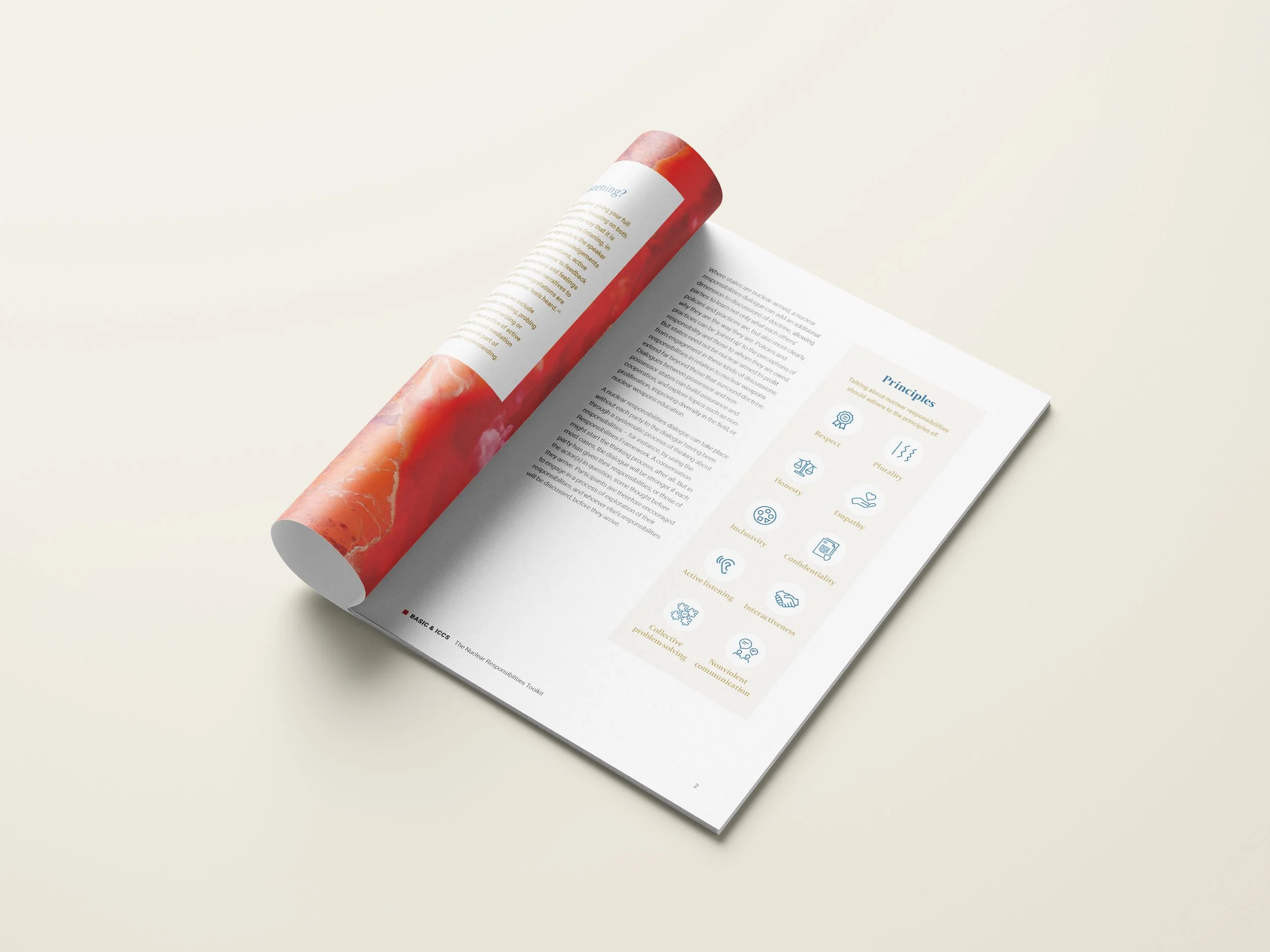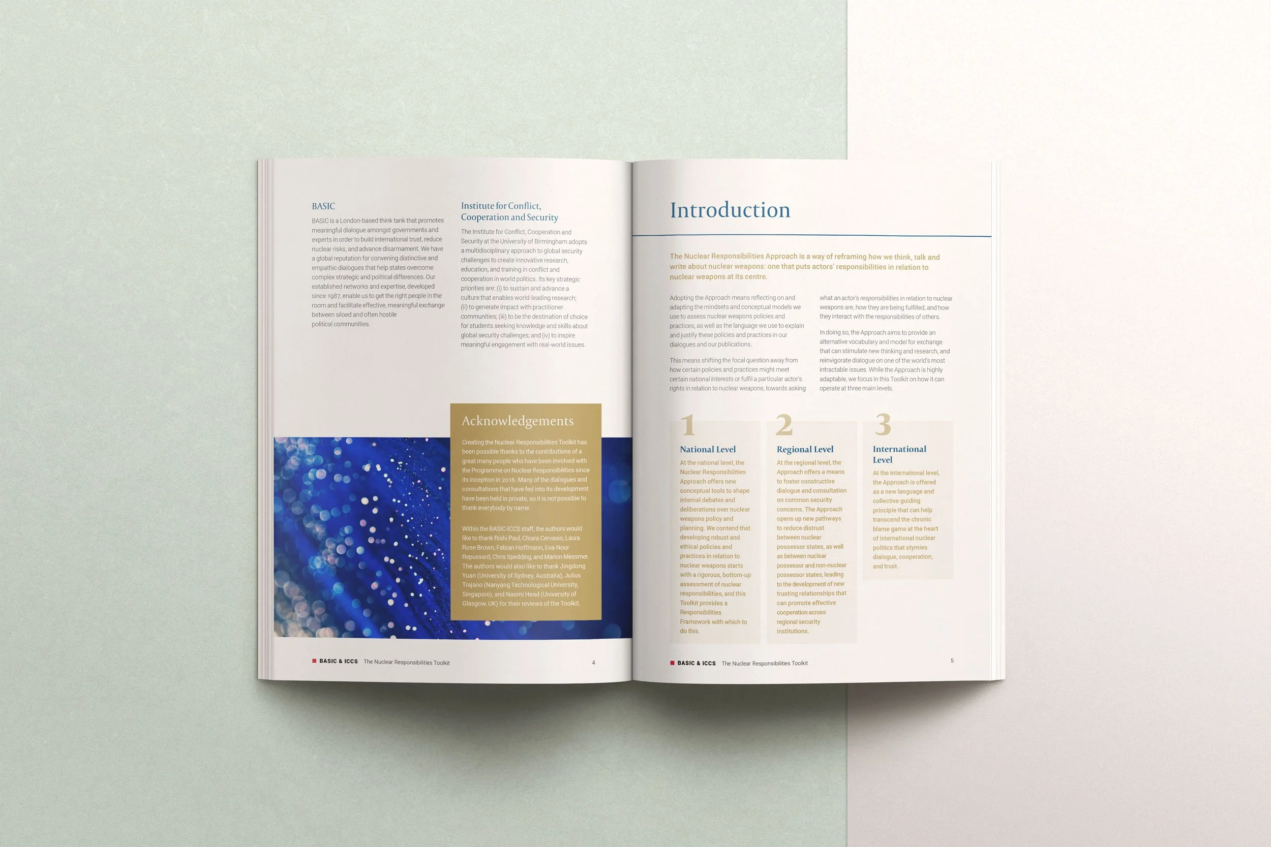 BASIC is a London-based think tank promoting nuclear disarmament. This toolkit was created to help facilitate joint conversation and action towards the cause. Being a very serious topic, we wanted to provide a calm colour palette and feature pages throughout to break up all the text.